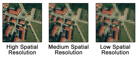 1. ความละเอียดเชิงพื้นที่ (Spatial Resolution) เป็นการระบุความละเอียดของจุดภาพ อธิบายได้ว่าเป็น ขนาดความกว้างยาวของพิกเซลของภาพ นิยมเรียกขนาดพิกเซลนี้ว่าค่า GSD (Ground Sampling Distance) ซึ่งถ้าความละเอียดเชิงพื้นที่ยิ่งมากขึ้นจะสามารถถ่ายภาพได้ละเอียดมากขึ้น มีผลต่อการระบุ ลักษณะภูมิประเทศที่ถ่ายได้ละเอียดยิ่งขึ้น แต่ความกว้างในการถ่ายจะน้อยคงหรือแคบลง