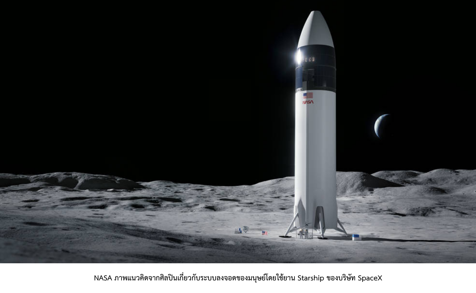 "การสำรวจ ณ ขั้วใต้ของดวงจันทร์" – NASA ได้เลือก SpaceX ให้เป็นผู้พัฒนาระบบลงจอดของมนุษย์ โดยยาน Starship จะทำหน้าที่ขนส่งนักบินอวกาศจากยาน Orion ในวงโคจรดวงจันทร์ลงสู่พื้นผิวและกลับขึ้นมา. ก่อนภารกิจของลูกเรือ SpaceX มีแผนที่จะส่งยาน Starship แบบไร้ลูกเรือลงจอดบนพื้นผิวดวงจันทร์อย่างน้อยหนึ่งครั้งเพื่อทดสอบระบบและผ่านข้อกำหนดด้านความปลอดภัยของ NASA